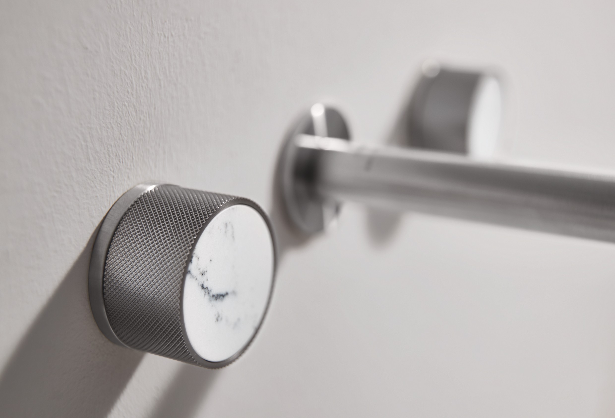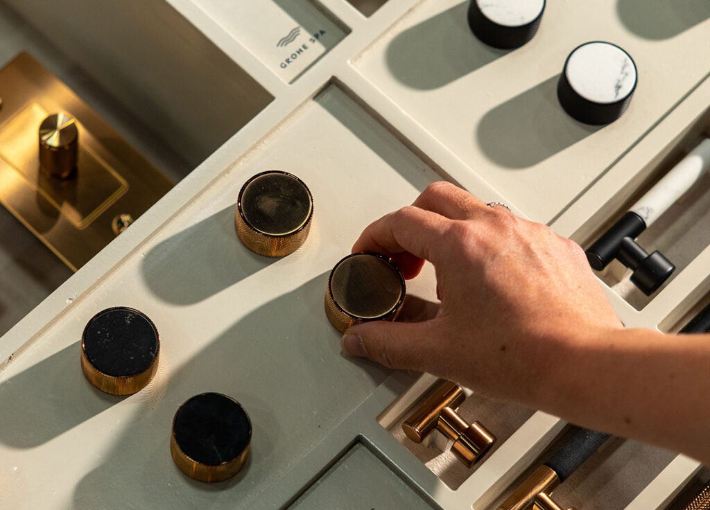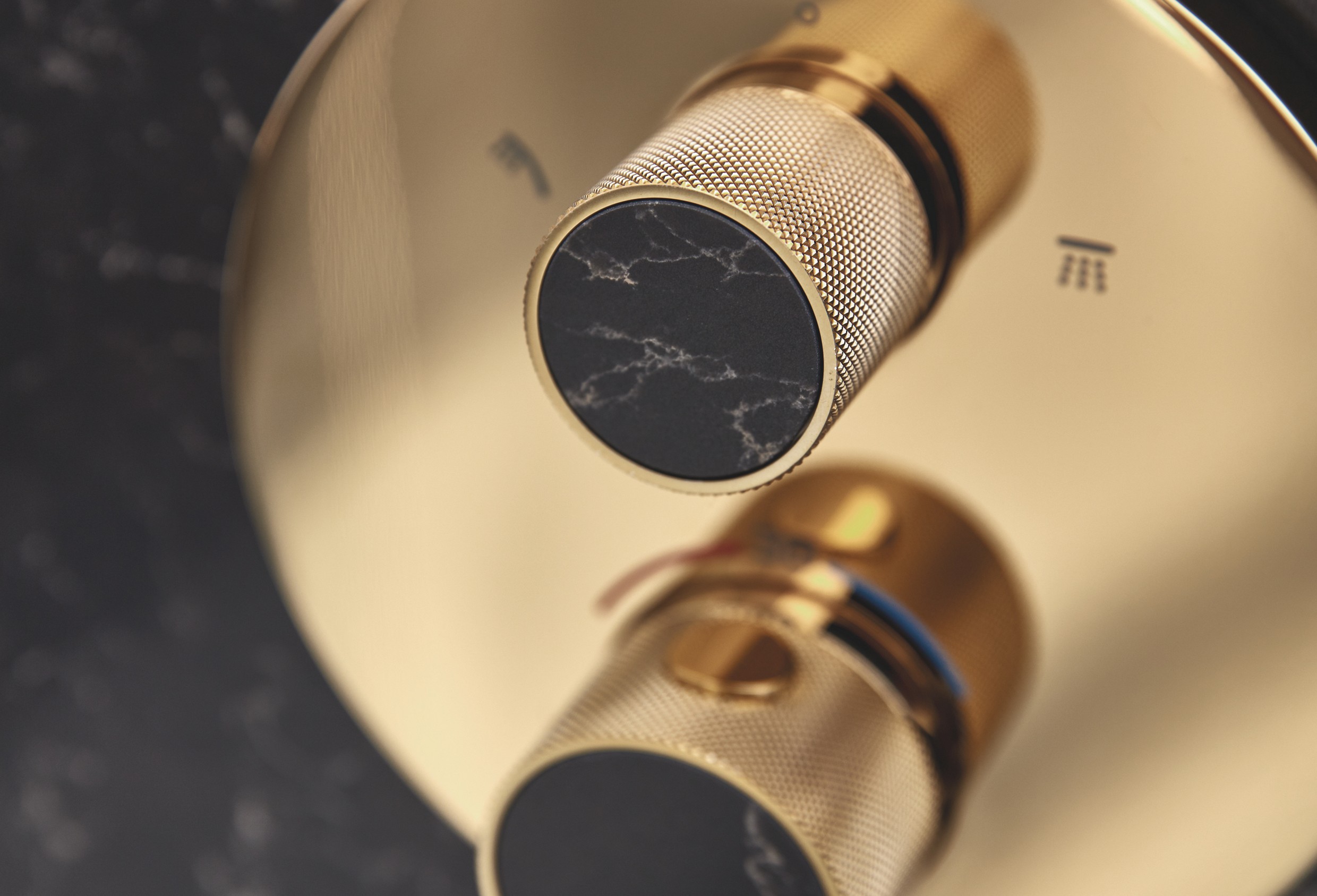Die kleinen Caesarstone Elemente, die in die glänzenden GROHE SPA Armaturen integriert sind, wirken wie edle Schmuckstücke.