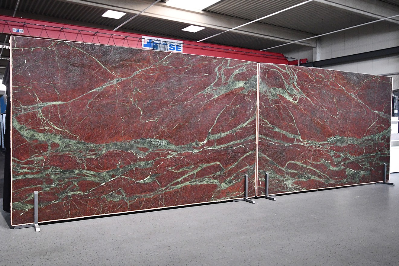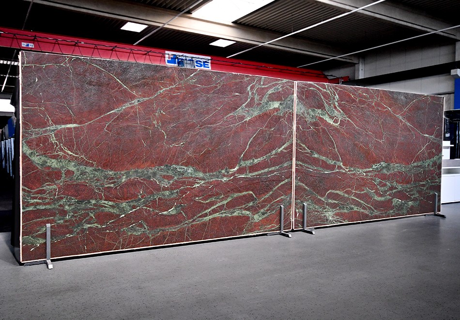 Trotz seiner intensiven Farbgebung bleibt der Quarzit vielseitig einsetzbar. Ob als Küchenarbeitsplatte, Wandverkleidung oder im hochwertigen Objektbereich – Moulin Rouge lässt sich auch in schlichte, reduzierte Konzepte integrieren und setzt dort bewusst starke Akzente, ohne den Raum zu dominieren.