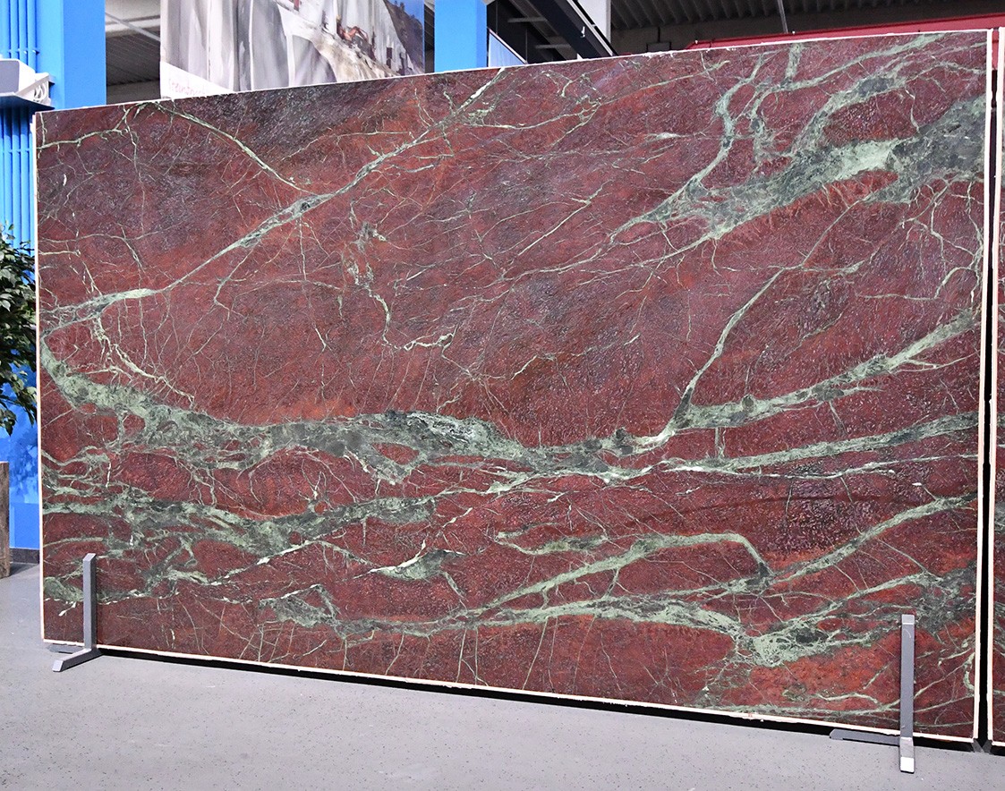 Mit Moulin Rouge präsentieren wir einen außergewöhnlichen Quarzit aus Brasilien, der sofort ins Auge fällt und lange im Gedächtnis bleibt. Seine kräftige rote Grundfarbe, durchzogen von markanten grünen Adern, erzeugt ein faszinierendes Spiel aus Kontrasten und Tiefe. Rot und Grün treffen hier in einer seltenen, natürlichen Harmonie aufeinander – kraftvoll, lebendig und zugleich edel.