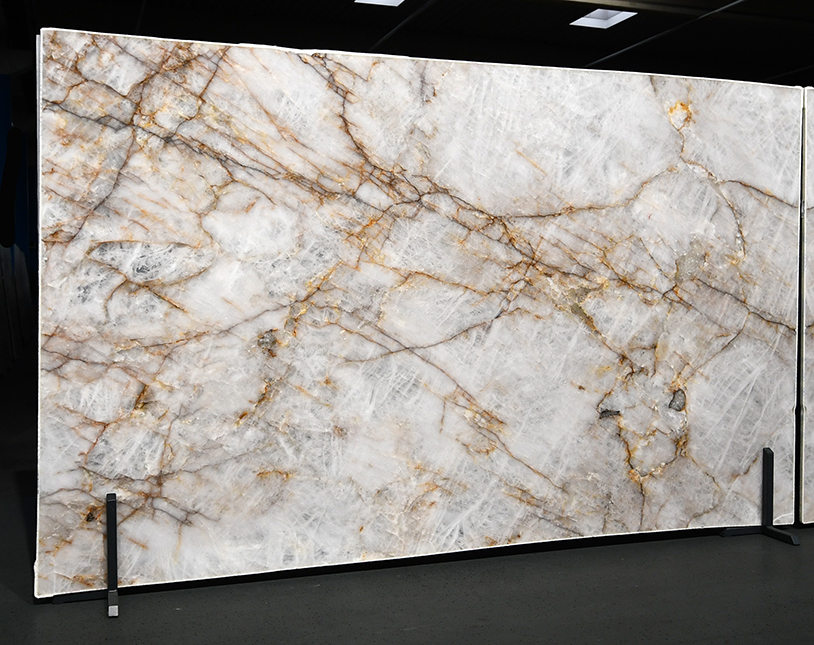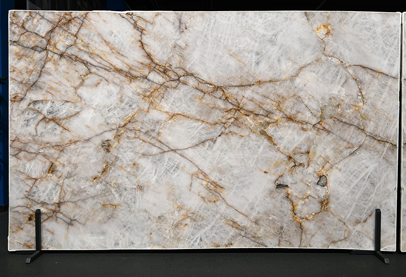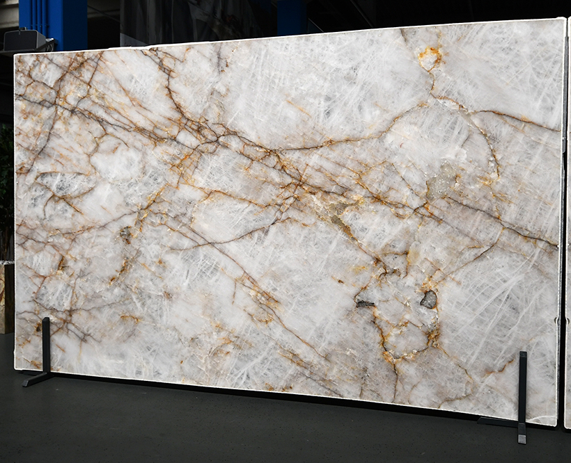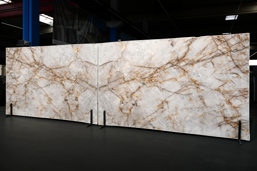 Cristallo Regnatela ist ein sehr edler Quarzit aus Brasilien. Auf seinem klaren weißen Grund befinden spinnennetzartige braune bis goldfarbende Adern. Eine ganz besondere Eigenschaft dieses Materials ist seine Transluzenz. Diese Eigenschaft in Kombination mit der klaren, kristallinen Optik machen das Material zur idealen Wahl für hinterleuchtete Anwendungen im Innen- und Außenbereich.