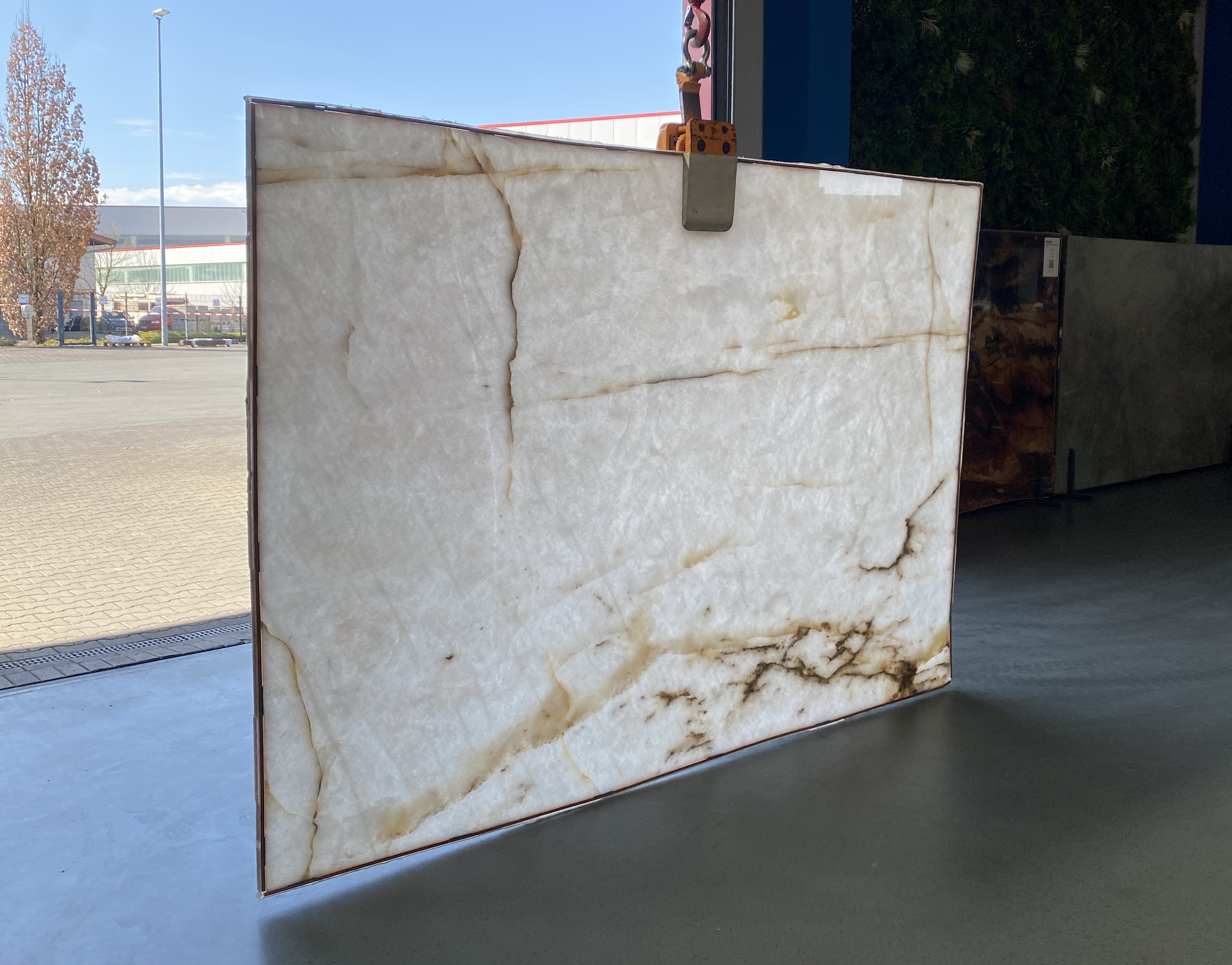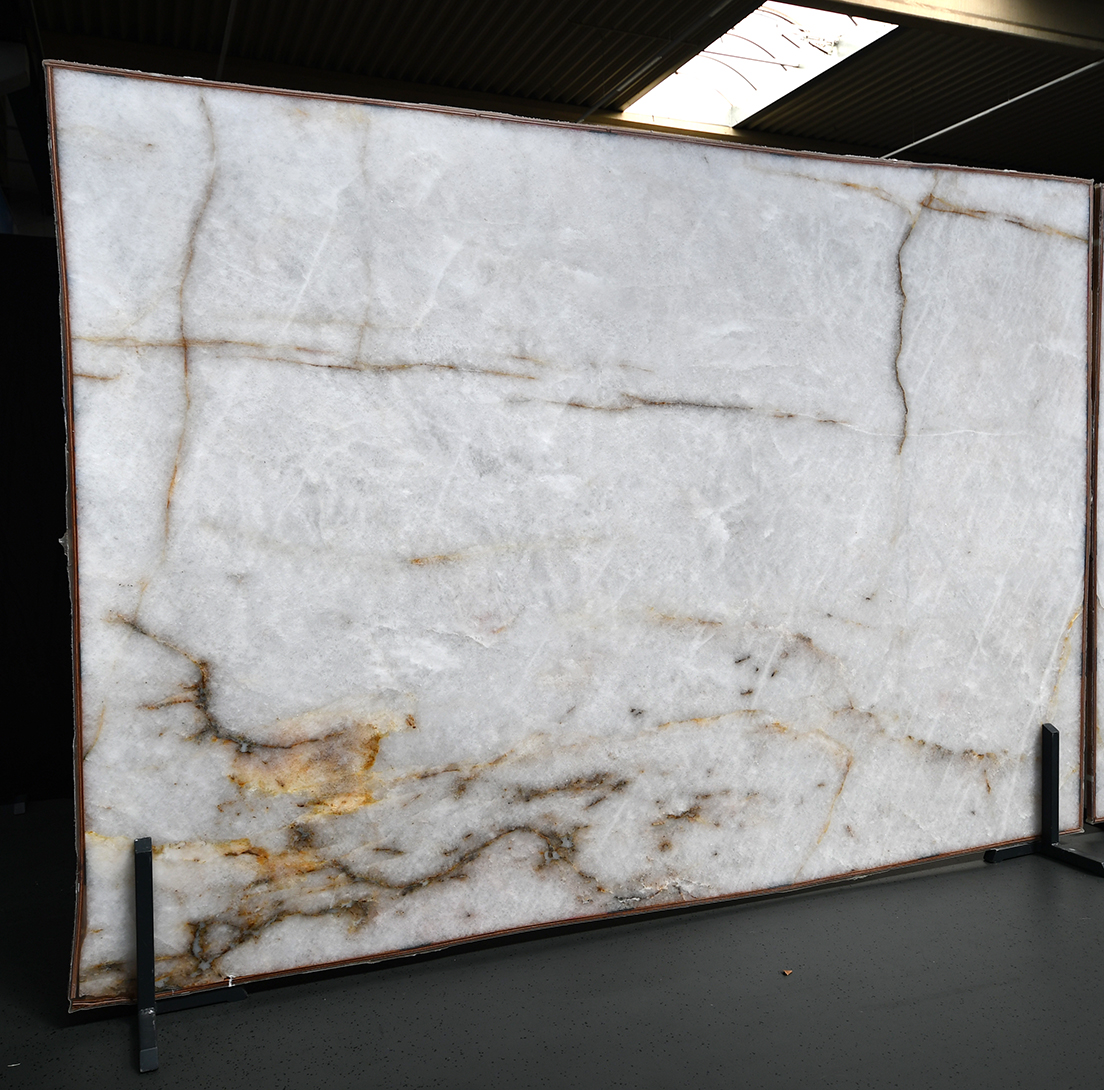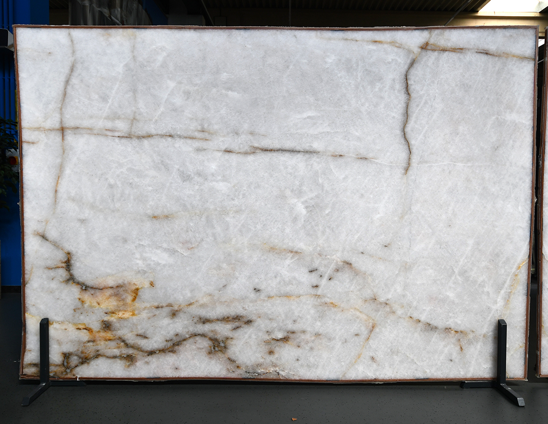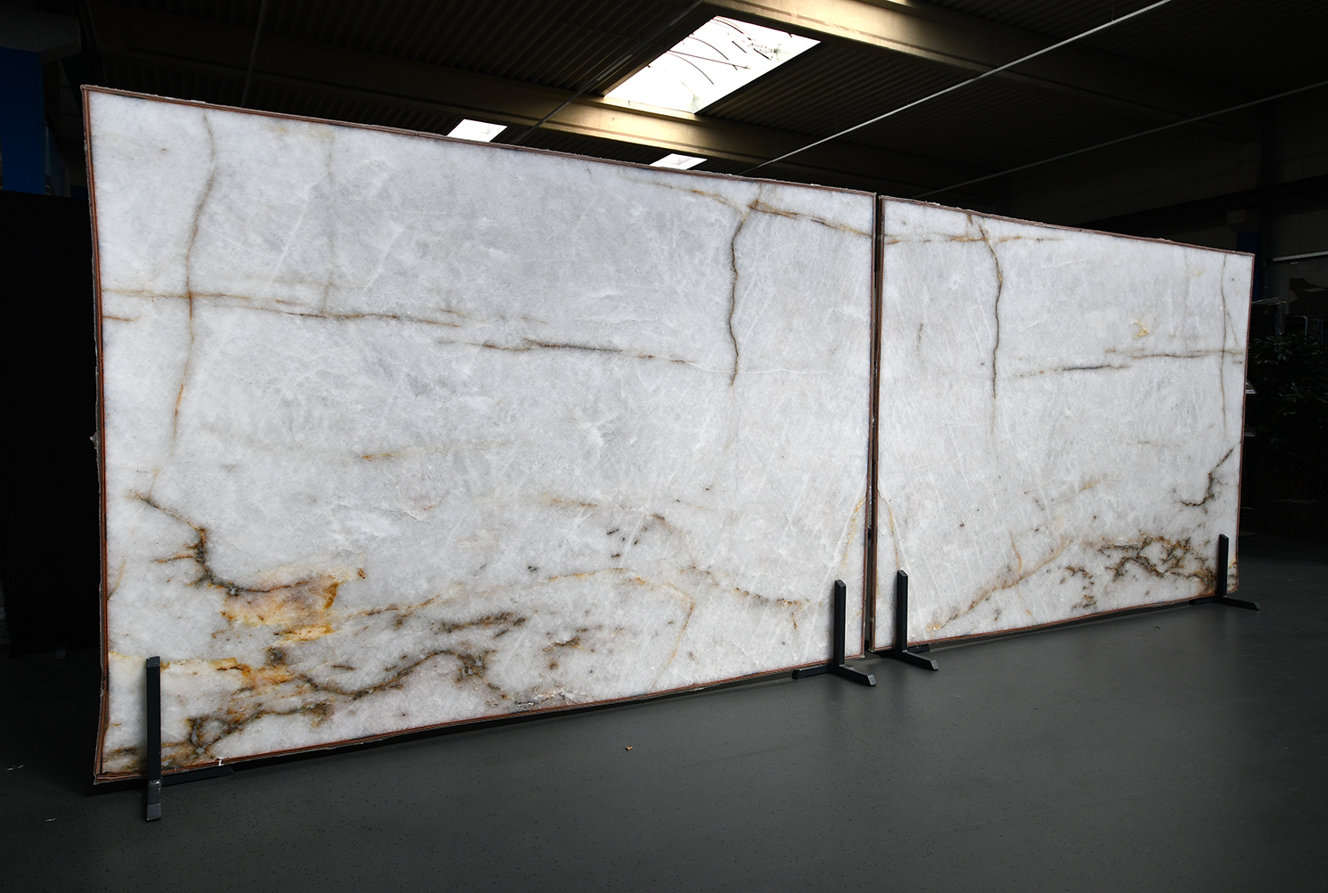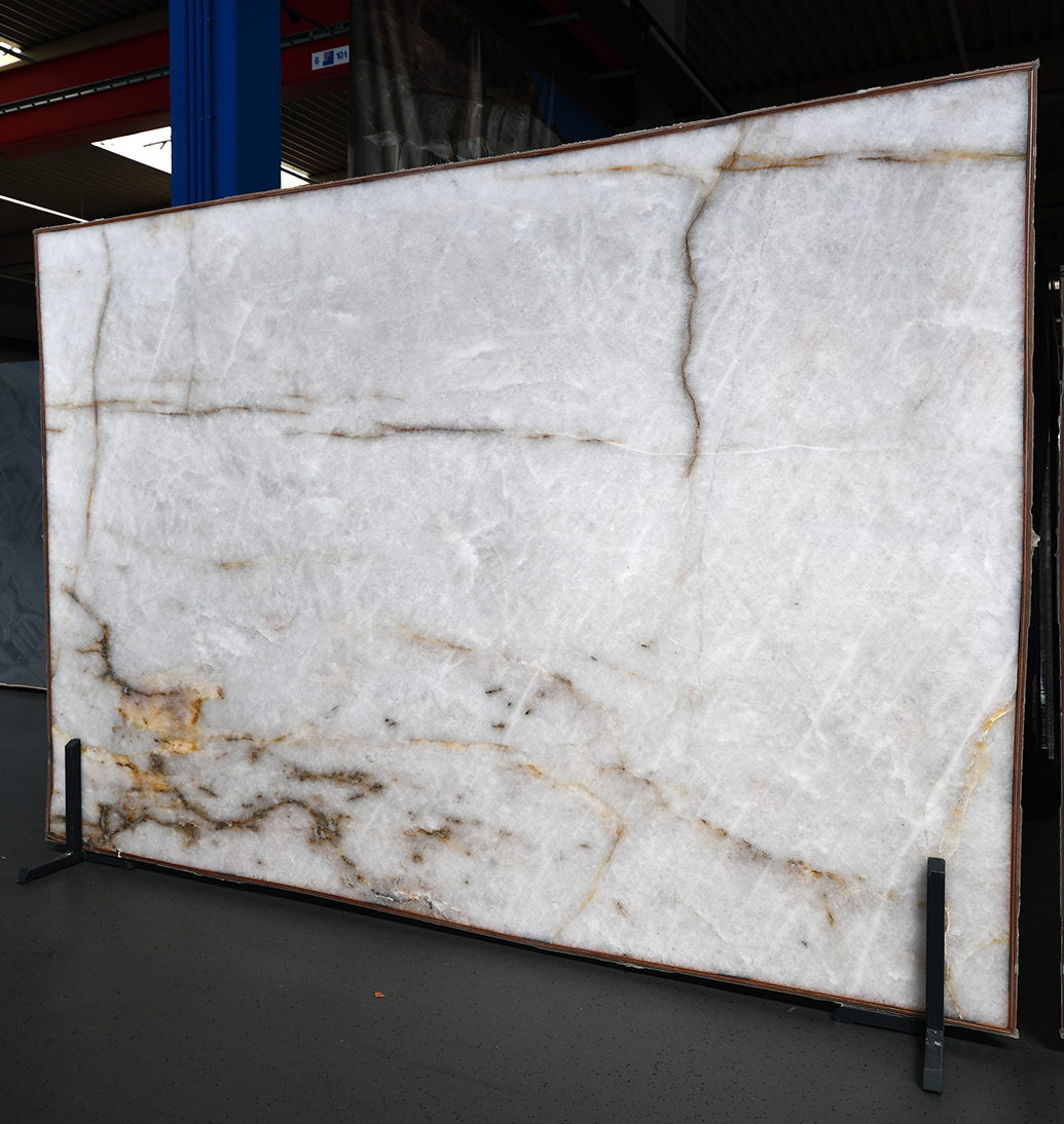 Cristallo Superiore ist ein sehr edler Quarzit aus Brasilien. Auf seinem klaren weißen Grund befinden sich braune bis goldfarbende Adern. Eine ganz besondere Eigenschaft dieses Materials ist seine Transluzenz. Diese Eigenschaft in Kombination mit der klaren, kristallinen Optik machen das Material zur idealen Wahl für hinterleuchtete Anwendungen im Innen- und Außenbereich