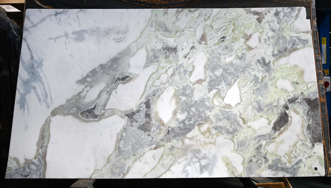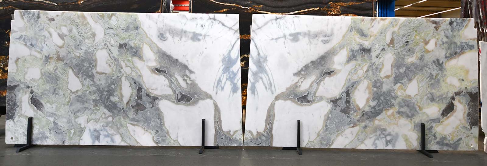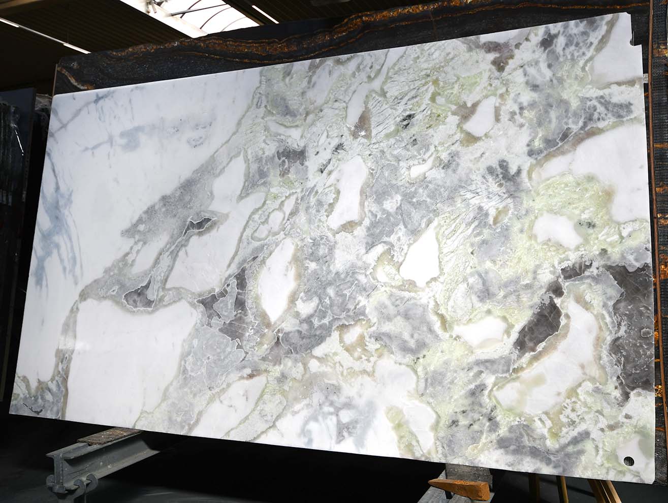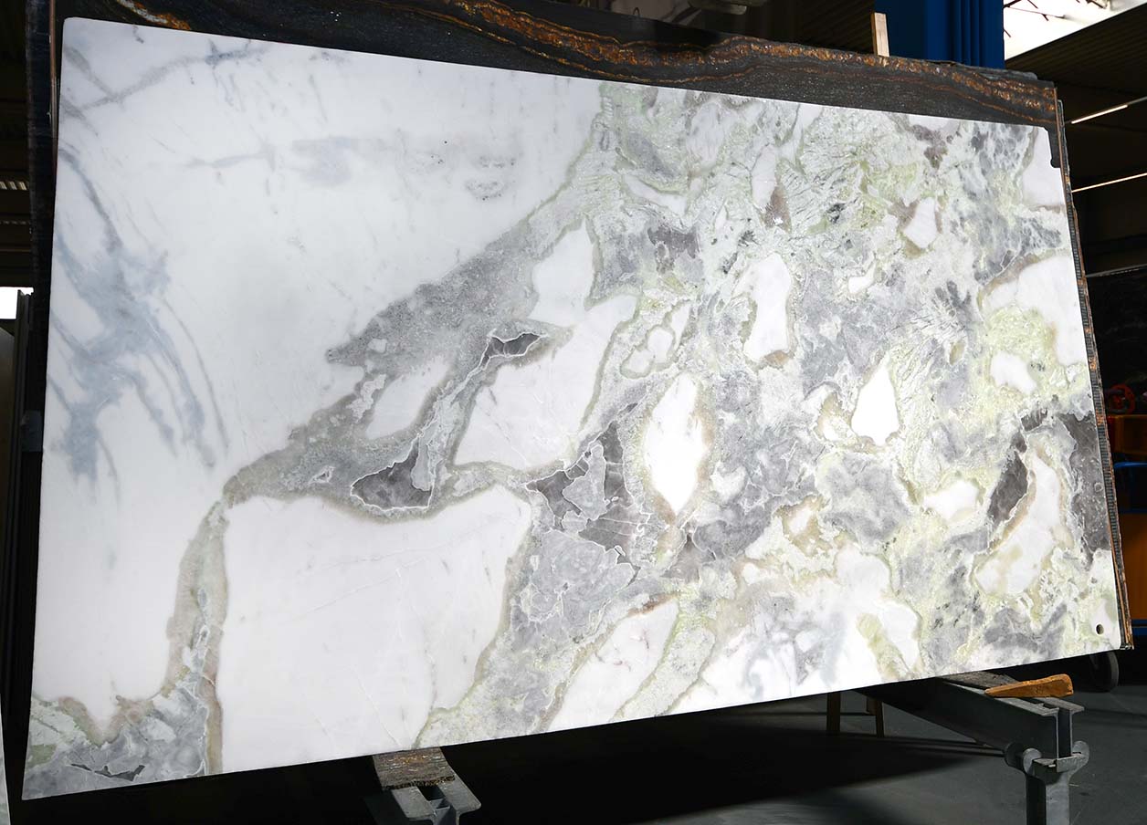 Dover Green bietet das gleiche eindrucksvolle Muster wie der Dover White nur mit einem tollen Farbspiel aus Grün- und Brauntönen. Dieser außergewöhnliche Marmor aus Namibia wirken durch die schimmernden und leicht transluzenten Einschlüsse besonders einzigartig. Auch eine hinterleuchtete oder spiegelbildliche Umsetzung gelingt mit diesen Materialien hervorragend.