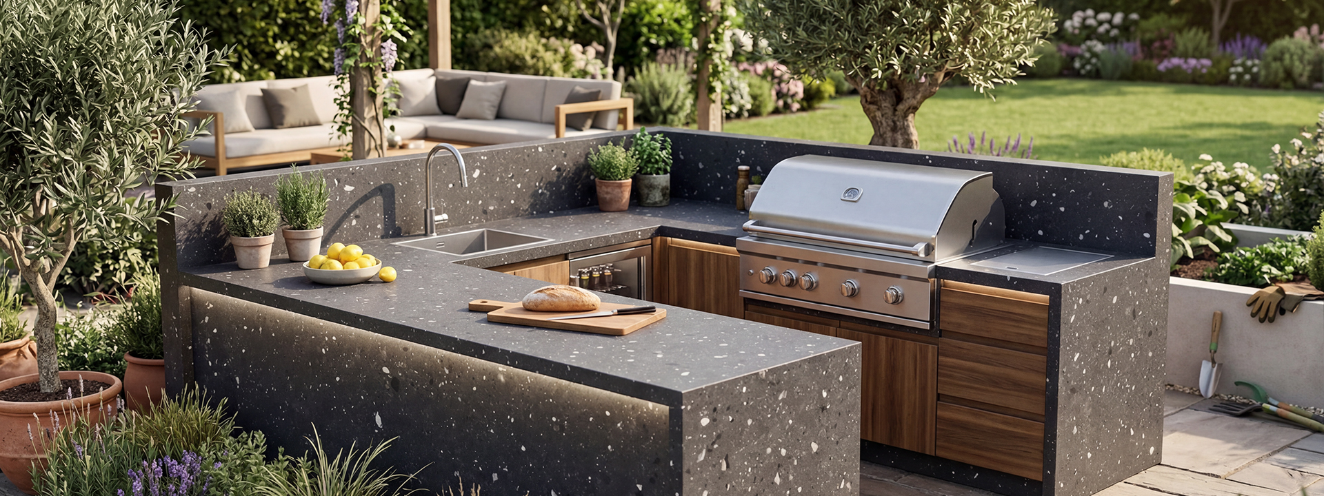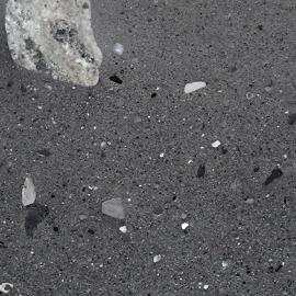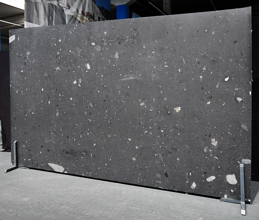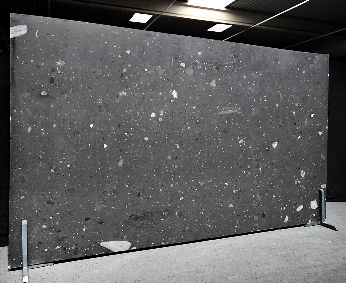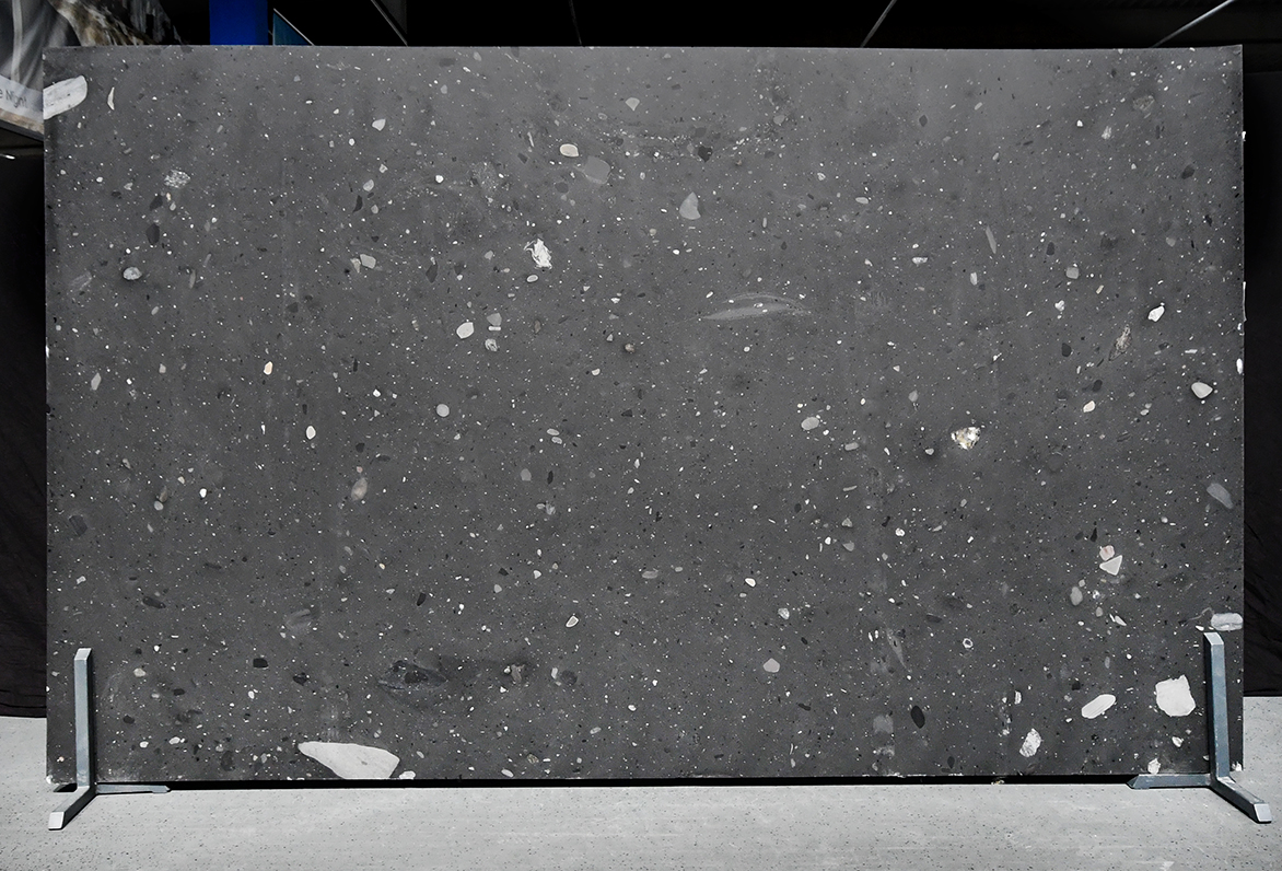 Occhi Neri ist ein schwarzer Naturstein aus Angola mit eingeschlossenen Kieselsteinen, die ihm visuelle Tiefe und interessante Kontraste verleihen. Durch seine dunkle Farbe und natürlichen Muster passt er perfekt zu modernen, industriellen Wohnstilen und eignet sich ideal für Arbeitsplatten, Böden oder Wandverkleidungen.