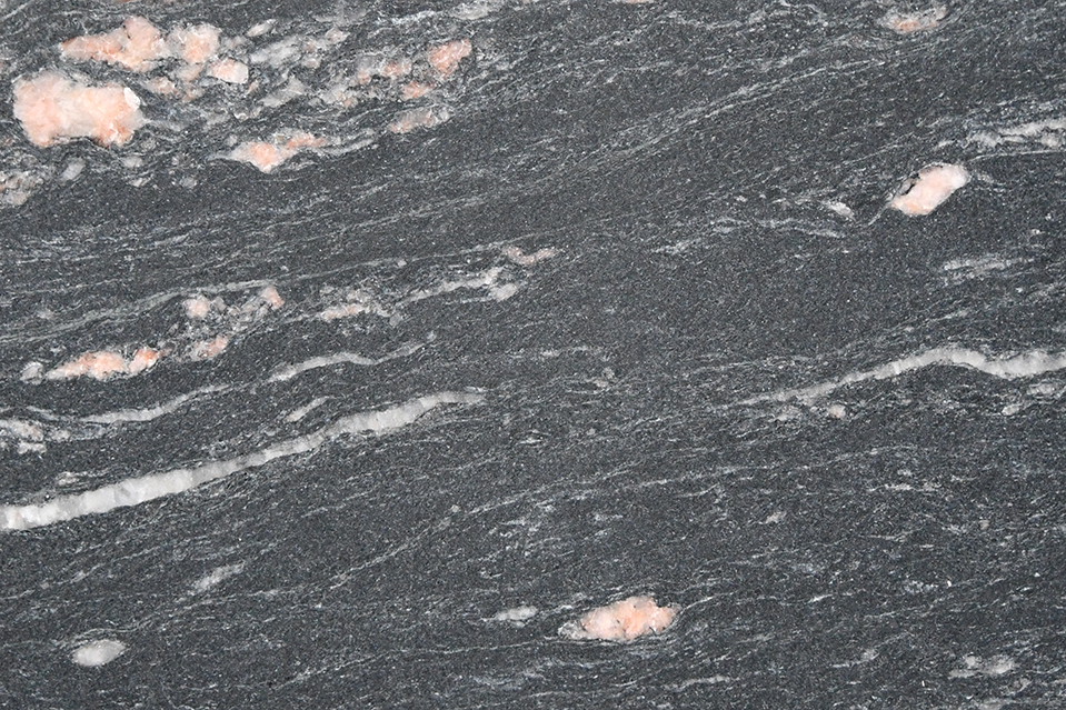Porto Rose ist ein schwarzes Hartgestein mit einer sehr interessanten Struktur. Auf seinem schwarzen Grundfarbton verlaufen dünne, helle Wellenlinien mit einigen beigen oder rosa Einschlüssen.