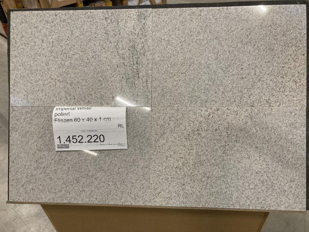 Hierbei handelt es sich ausschließlich um die Lagerbestände des Artikels Imperial White poliert Fliesen 60 x 40 x 1 cm ACHTUNG: Materialbedingte Wölbung möglich!